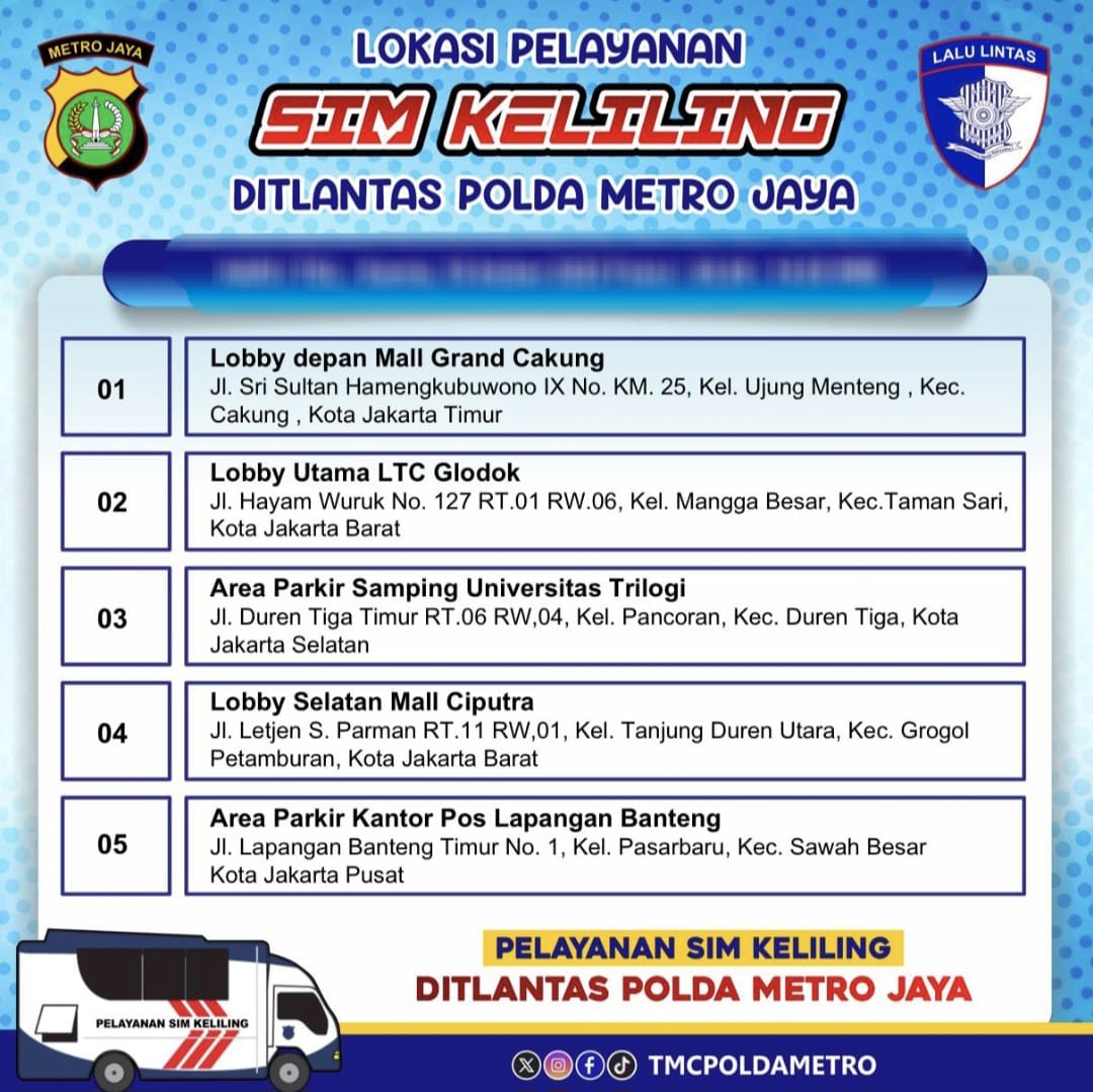 Berikut 5 lokasi layanan mobil SIM Keliling, mengutip publikasi di akun media sosial TMC Polda Metro Jaya: