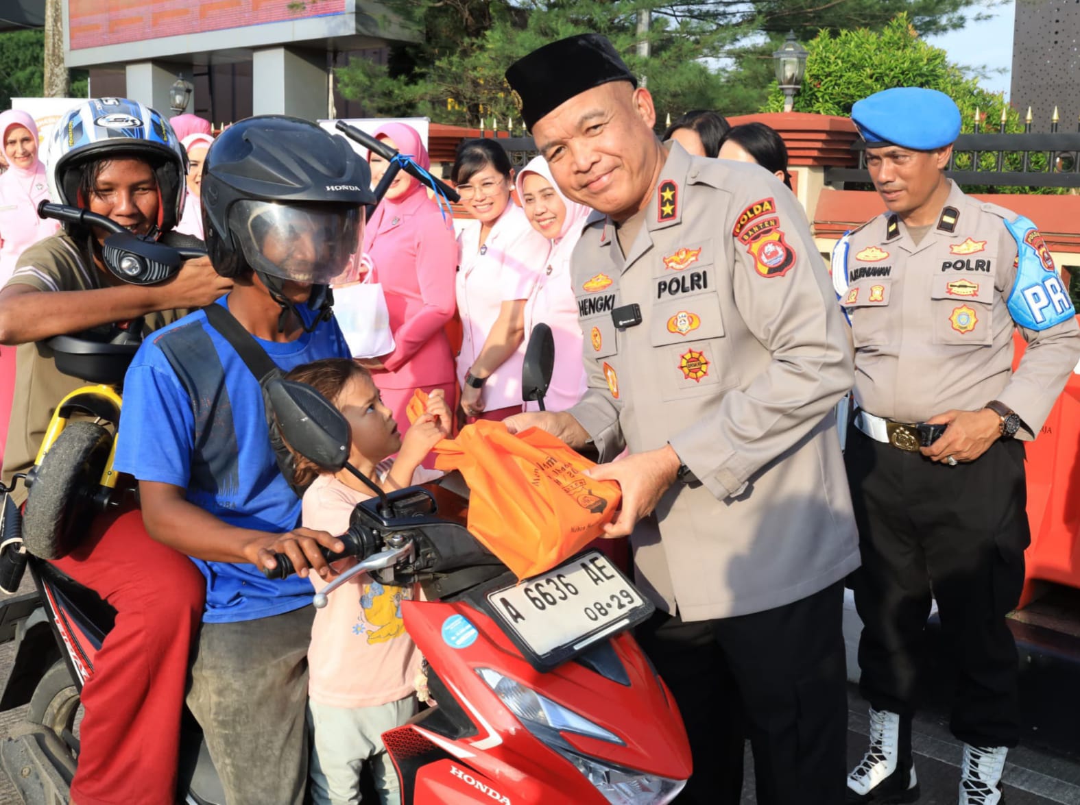 SERANG : Polda Banten melaksanakan kegiatan bagi-bagi takjil kepada masyarakat di sekitar Mapolda Banten. Selain kapolda, turut juga menyerahkan makanan ringan untuk berbuka puasa itu adalah Wakapolda Banten Brigjen Pol Hendra Wirawan, para pejabat utama serta Bhayangkari Daerah Banten
