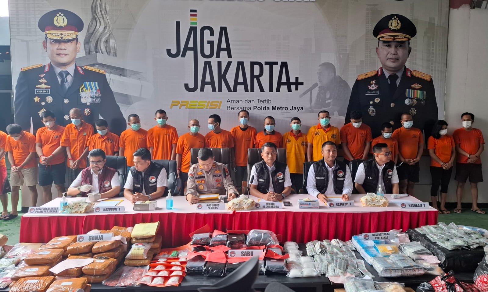 Adapun barang bukti yang diamankan antara lain 60,33 kg sabu, 95 kg ganja, 32.800 butir ekstasi, 782.160 butir obat keras daftar G, serta narkotika jenis lain seperti tembakau sintetis, etomidate, hingga kokain.