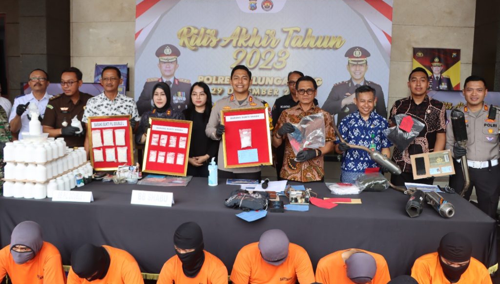 “Kerja keras bersama ini berhasil mengamankan barang bukti Narkoba tahun 2023 Sabu 305,46 Gram, Ganja 9,77 Gram, Ekstasi 14 butir, Pil Alprazolam 390 Butir Pil Trihexphenidyl 30 butir, Pil Deazepam 1 butir, PIL LL yang banyak di salah gunakan oleh remaja 264.189 Butir, 1 galon miras jenis arak dan 688 botol Miras berbagai merk,” sambungnya.