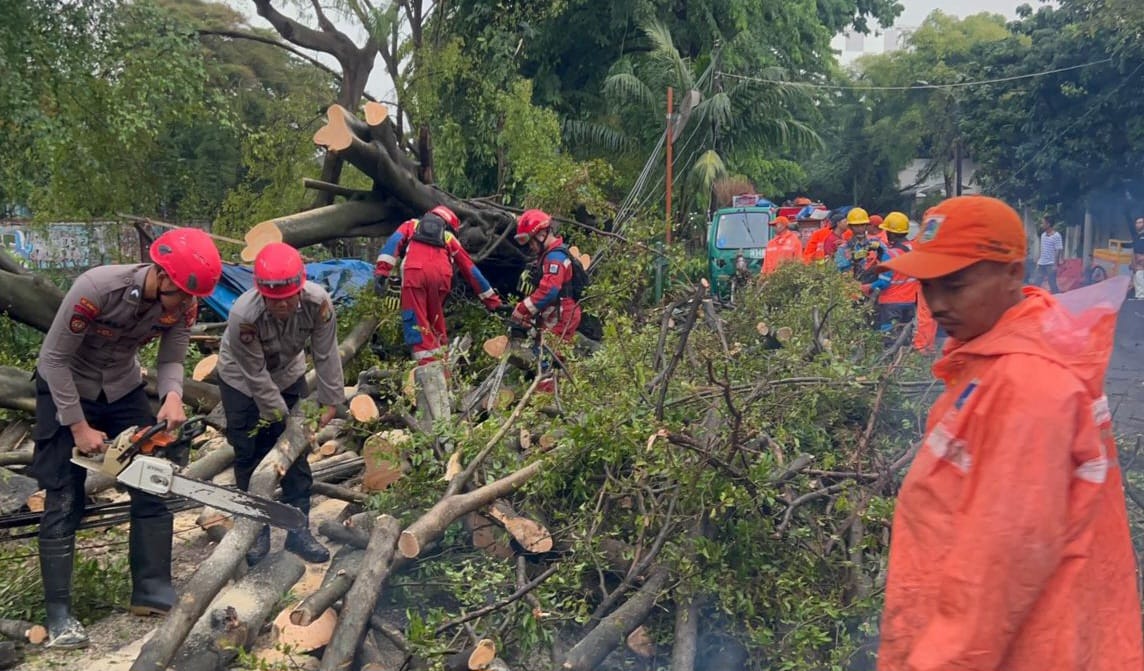JAKARTA: Tim SAR Ditsamapta Polda Metro Jaya melalui Patroli Jaga Jakarta menangani peristiwa pohon tumbang di dua lokasi wilayah Jakarta Pusat, Jumat (12/12/2025) sore.